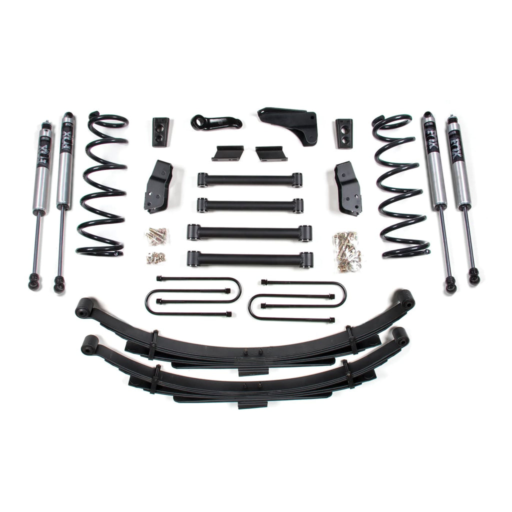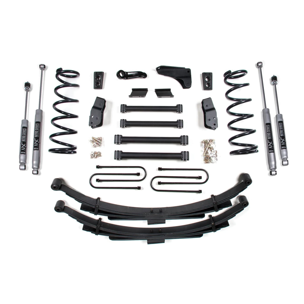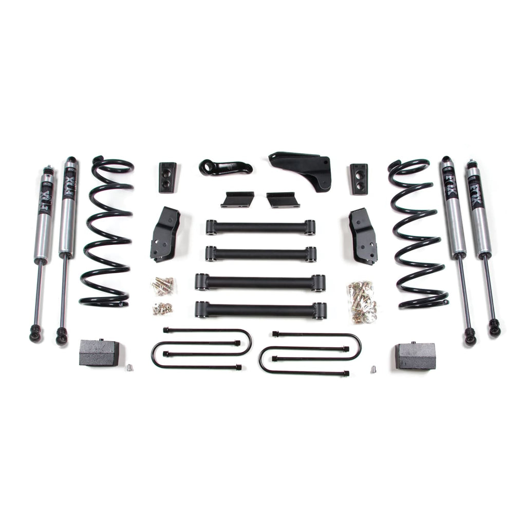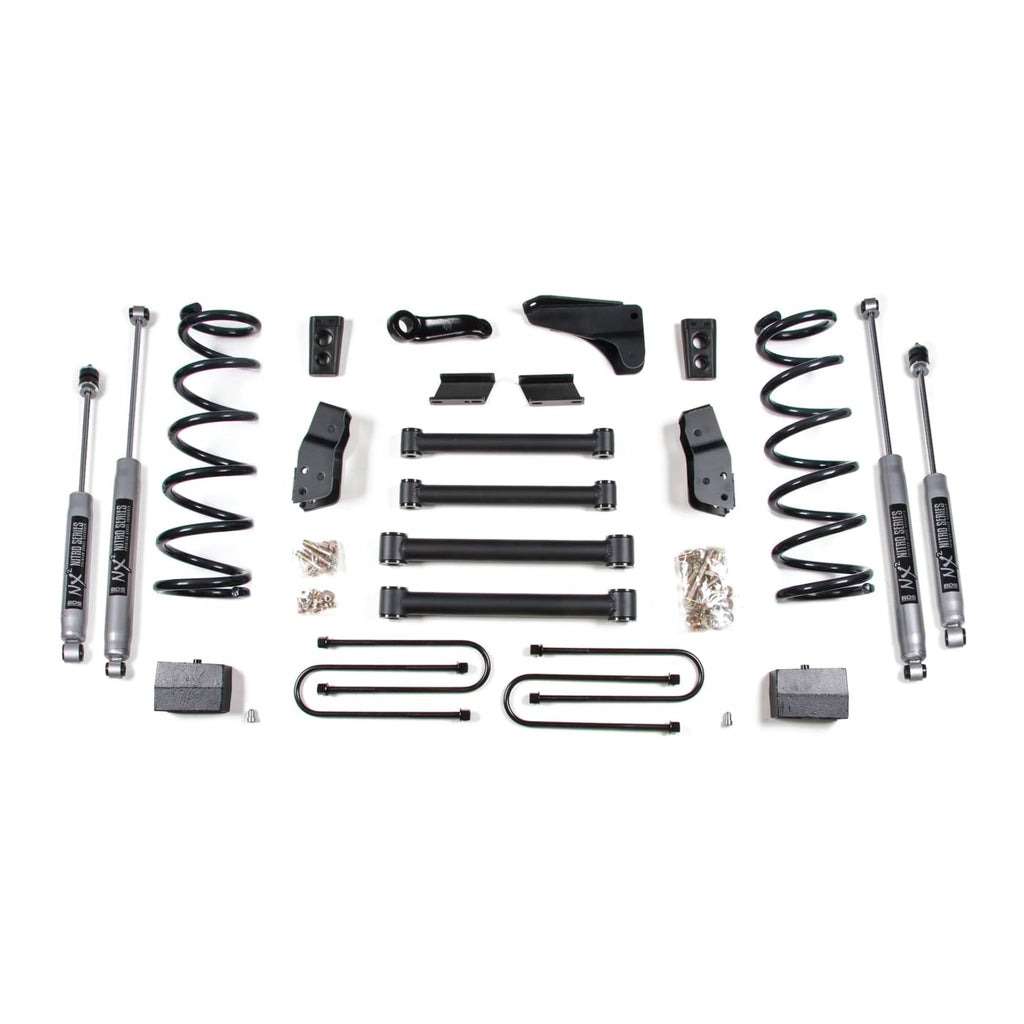 Up front the lift kit includes diesel-specific Pro-Ride coil springs, all four control arms plus relocation bracket, forged drop pitman arm and track bar bracket for steering correction, bump stops, sway bar links, and precision tuned NX2 or FOX 2.0 nitrogen charged shocks. In the rear this kit utilizes heavy duty cast steel blocks, longer u-bolts, and a matching set of NX2 Nitro or FOX 2.0 Performance shocks.