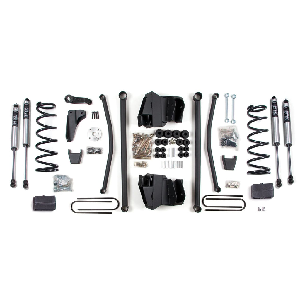 Up front the lift kit includes diesel-specific Pro-Ride coil springs, all four control arms plus mounting bracket, forged drop pitman arm and track bar bracket for steering correction, bump stops, sway bar links, and precision tuned NX2 or FOX 2.0 nitrogen charged shocks. In the rear this kit utilizes heavy duty cast steel blocks, longer u-bolts, and a matching set of NX2 Nitro or FOX 2.0 Performance shocks.