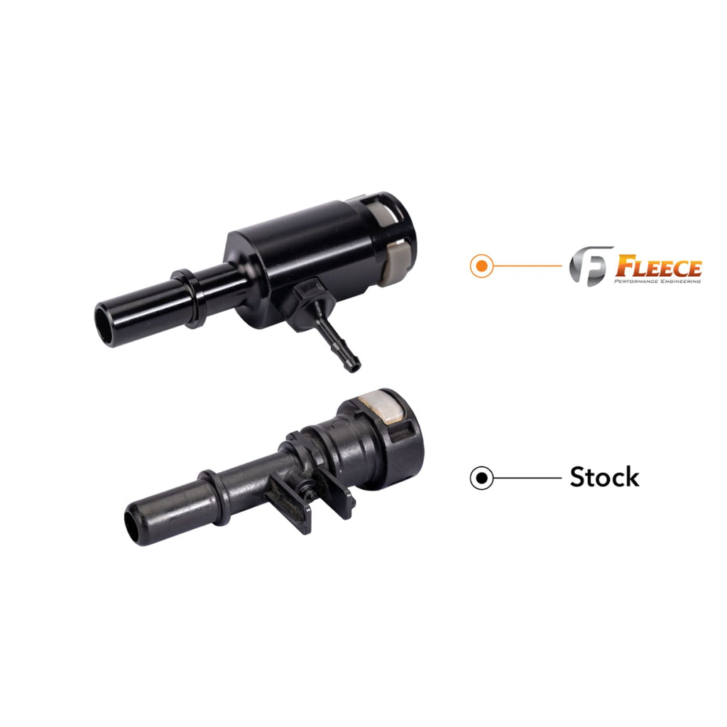 The plastic factory injector return fitting on the 2011-2016 6.7L Power Stroke is susceptible to breakage from heat, vibration, rough handling, and frequent disconnections for fuel filter maintenance. Upgrade this fitting and eliminate the risk of a broken fuel line with our heavy duty billet aluminum injector return fitting. Featuring a dual O-ring internal design and serviceable barb fitting the Fleece Performance injector return fitting will ensure you're not left stranded with a broken, non-repairable fuel line.