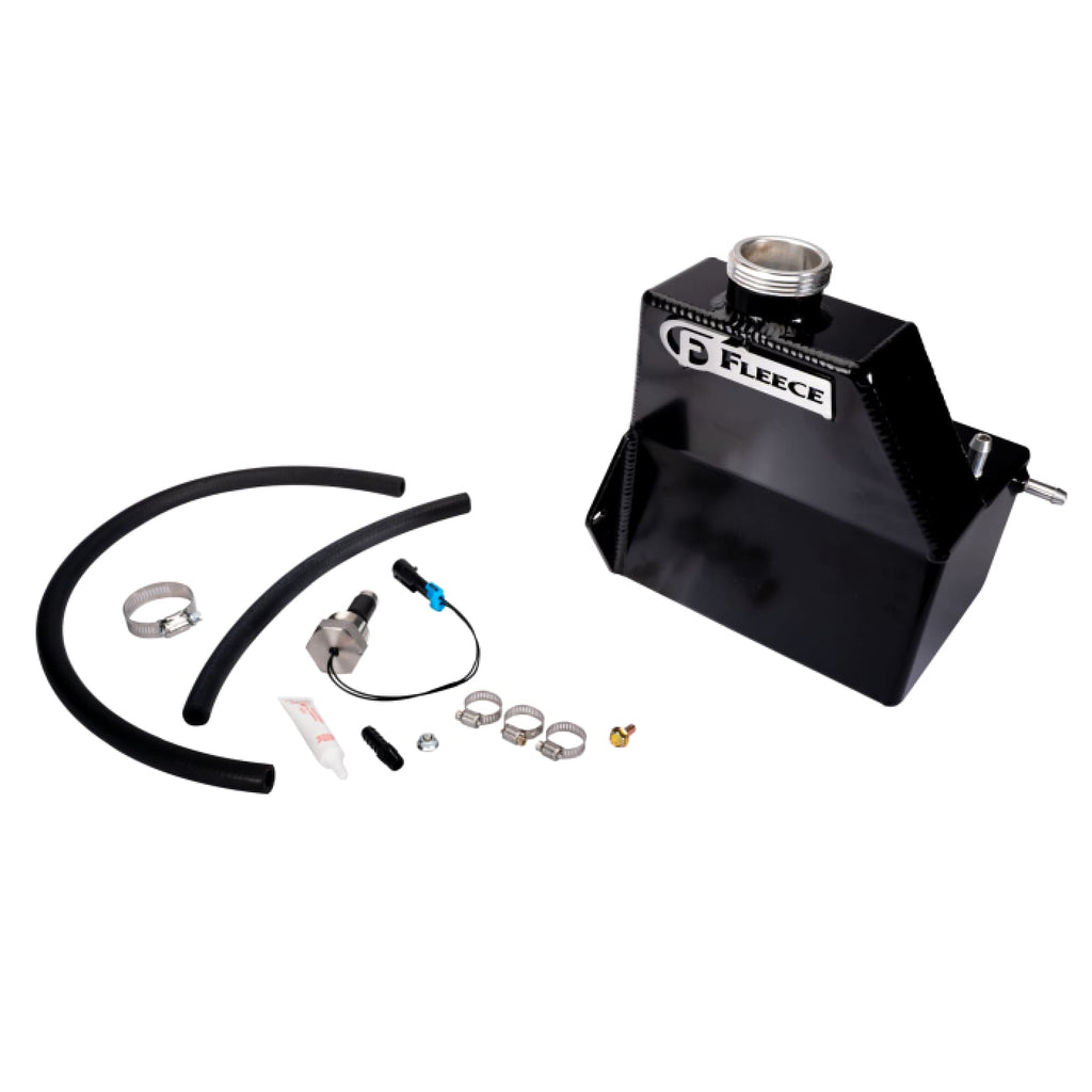 Fleece's upgraded coolant tank features high quality aluminum that is hand fabricated and tig welded with a durable gloss black powdercoated finish. These coolant tanks provide a substancial improvement in durability while eliminating leaks and freeing up space in the engine bay for larger turbo systems.
