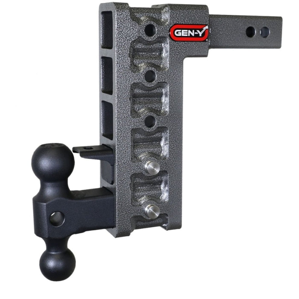 GEN-Y's Mega-Duty Adjustable Drop Hitches start at 10,000 LB towing capacity and go up to 32,000 LB towing capacity. There are multiple drop options as well depending on your trailer towing needs.