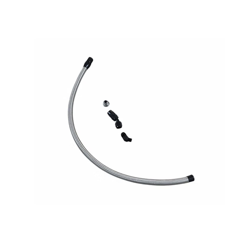 This kit is offered to upgrade your compound kit to a -10AN size return line. It does require cutting off the return line fitting on your turbocharger pedestal and having the included -10 bung welded on. We typically tap the upper pan near the starter so the line provided is longer than needed but will get you to this location. You will cut to exact length upon final assembly.
