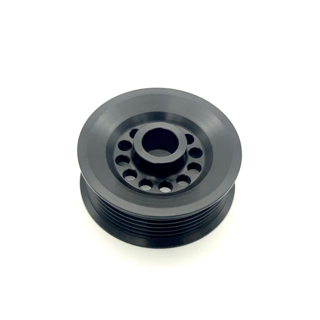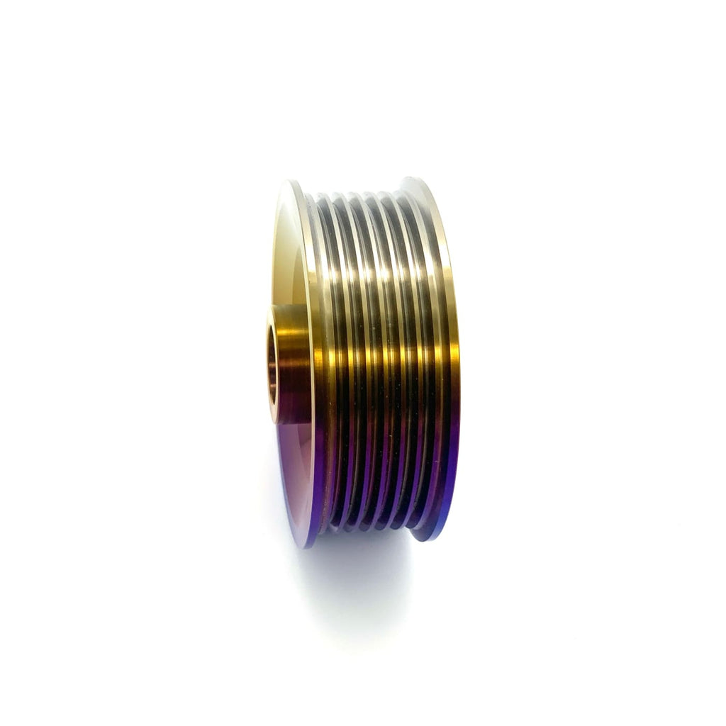 We decided to make this part from the lighter and stronger 6061 billet aluminum and anodize it black for a lifetime of use. The billet pulley is the best bang for your buck if looks aren't quite as important to you as going fast, but of course, we had to offer it in Titanium as well! The titanium pulley is a little heavier than the aluminum one, but it sure makes up for it with the beautiful anodized colors!