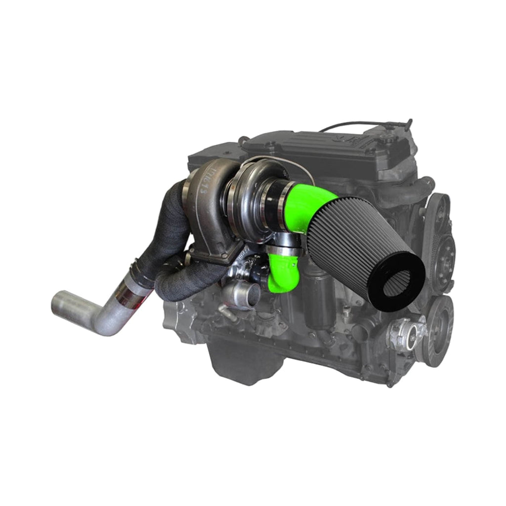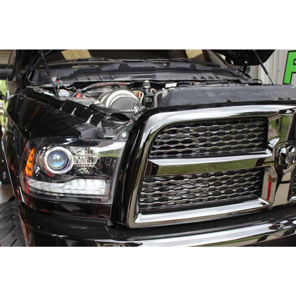 Built with precision, our plumbing components are TIG welded to produce beautiful welds with optimal penetration that doesn't impact airflow. This system has been designed to work with stock and most "stock replacement" aftermarket exhaust manifolds. The overall design and location of all components allow for easy access and installation. Our Pusher 50 CAL Bullet Filter amplifies filter area to support maximum airflow and is positioned to take advantage of the large opening in the grill on late model RAM trucks. This filter feeds into our 5” cold air intake which has hidden sensor ports for a clean look. The entire assembly is tied to the alternator support to ensure a properly secured cold air intake. Includes a 5" massive inverted cone Pusher 50 CAL Air Filter and prefilter.