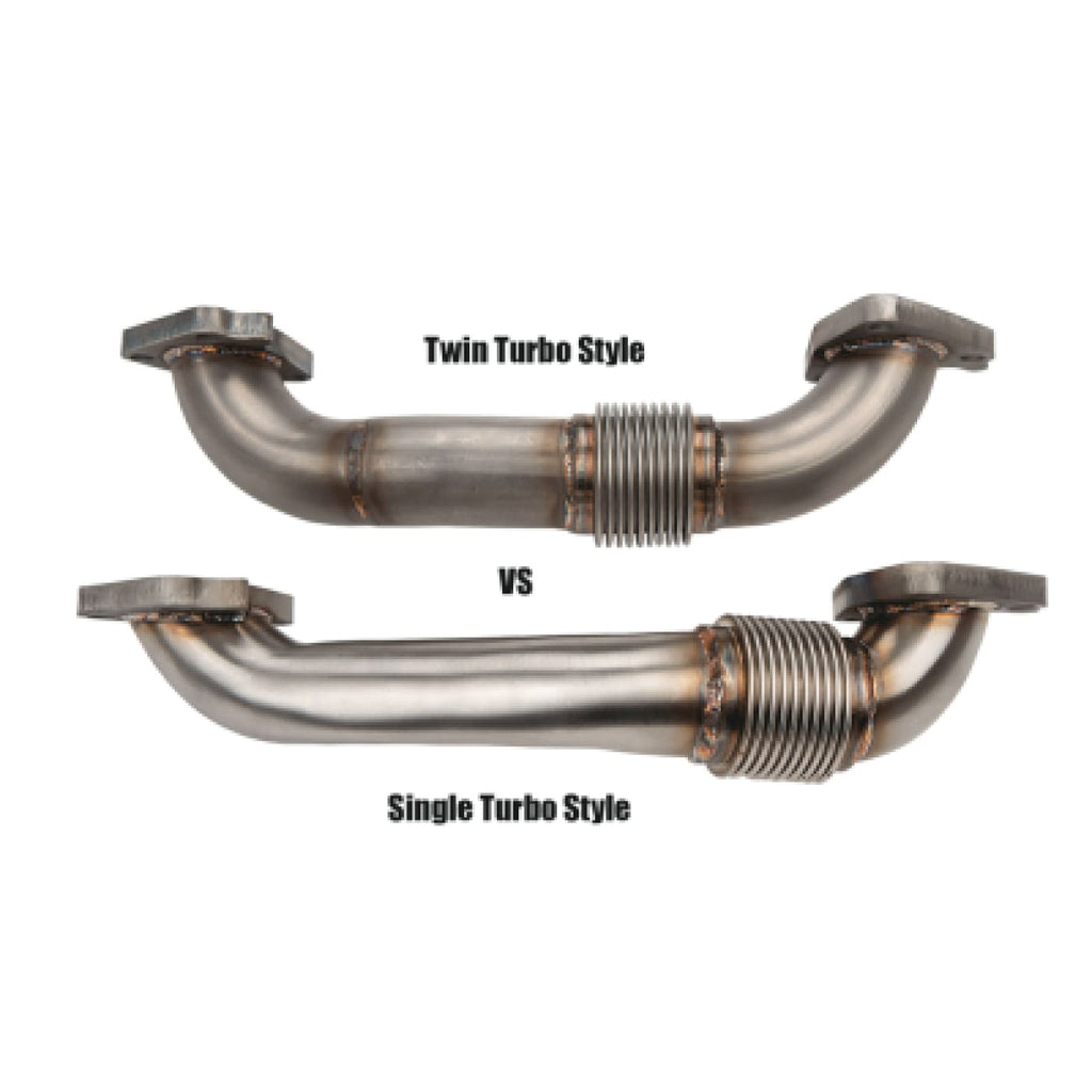 Replace the lightweight, leak-prone passenger side OEM up pipe with this heavy-duty 11 gauge 2" Stainless up pipe. HD Stainless Bellows that will not crack and leak like OEM. Increase Turbo spool-up and decrease EGTs. This up pipe is built with more sweeping, less aggressive bends for use in TWIN TURBO/Compound turbo STYLE APPLICATIONS ONLY.